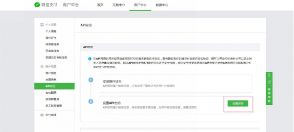 3.2.2 商家密钥点击“账户中心”->“API安全”菜单,设置32位密钥并记录备份,如下图示; 注意:密钥填写错误会导致支付异常,如期间修改请重新登录商城后台同步修改参数。
