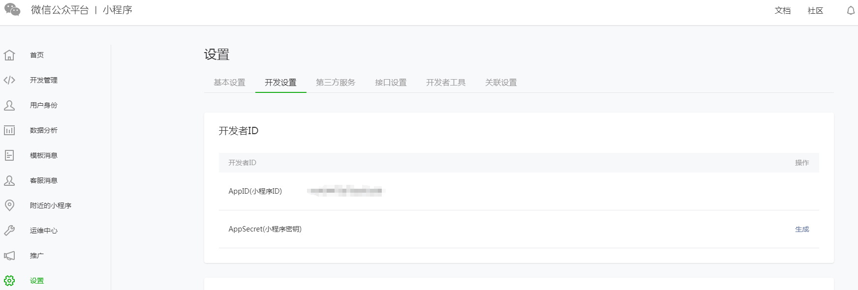 需要注意,AppSecret生成后不会明文存储在开发平台上,需要自行妥善保存,一旦遗失需要重新生成,可能会影响已发布小程序的正常使用。 2.2配置小程序服务器域名登录微信小程序后台,在设置——开发设置中,配置小程序服务器域名,详细配置如下: