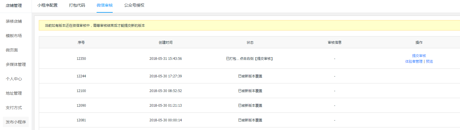 1.4提交审核/发布提交审核:每点击【一键打包】打包小程序,在“微信审核”页面会将会生成一条打包记录,点击【提交审核】将代码包提交到微信进行审核,微信审核周期一般为7个工作日,在提交审核前请先认真阅读《微信小程序平台运营规范》和《微信小程序平台常见拒绝情形》; 审核通过:微信审核通过后,点击【发布】按钮,稍等片刻,即可在手机微信小程序搜索中查到已发布的小程序,完成发布流程; 审核失败:如微信审核失败请注意可看失败提示,及时登录微信小程序后台处理相关问题; 注意:同一时间只允许提交审核1个小程序。