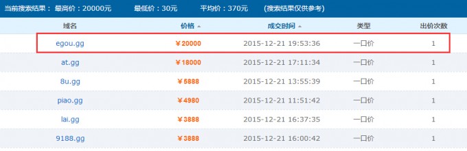 顶级域.GG频创新高,日交易额突破90万!三五互联12月22日消息,随着互联网+的发展,市场对域名的需求不断飙升,随着.com/.cn/.net资源的日趋饱和,各种新后缀渐渐映入大家眼帘。然而针对这一现象,几年前就有不少业内人士预言,.gg域名未来或将成为米友投资首选。果不其然,近来.gg域名不负众望,在三五互联交易市场一次次传出捷报,商业价值令投资者喜不自胜。 今天,顶级域名.gg被越来越多的人认可,我们从西数平台近期频繁的交易来看,.gg域名仅12月21日一天,交易额就突破90万元,其中一口价和竞拍交易交价格最高的域名egou.gg达到20000元,也就是说,用户开放时如果以498元的价格注册了这个域名,目前获利将近40倍。